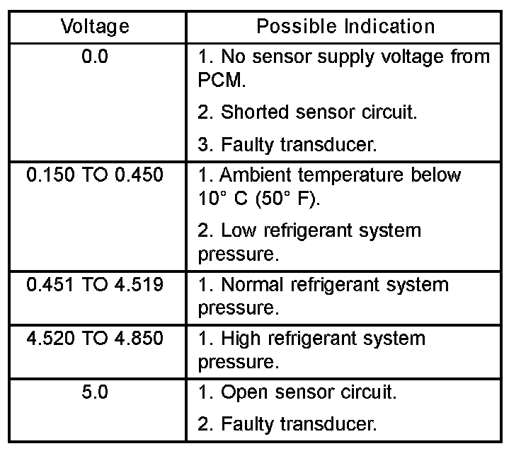 The A/C pressure transducer is tested using a DRBIII(R) scan tool. Refer to the appropriate diagnostic information. Before testing the A/C pressure transducer, be certain that the transducer wire harness connection is clean of corrosion and properly connected. For the air conditioning system to operate, an A/C pressure transducer voltage reading between 0.451 and 4.519 volts is required. Voltages outside this range indicate a low or high refrigerant system pressure condition to the Powertrain Control Module (PCM). The PCM is programmed to respond to a low or high refrigerant system pressure by suppressing operation of the A/C compressor. Refer to the A/C Pressure Transducer Voltage chart for the possible conditions indicated by the transducer voltage reading.