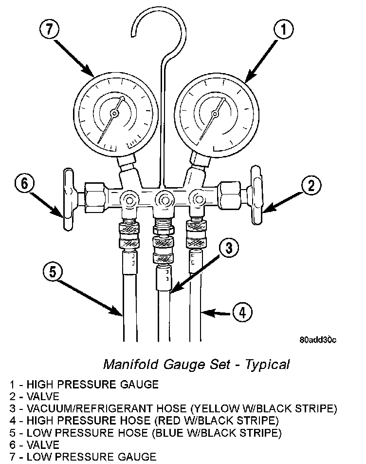 A manifold gauge set may be needed with some recovery/recycling/charging equipment. The service hoses on the gauge set being used should have manual (turn wheel), or automatic back-flow valves at the service port connector ends. This will prevent refrigerant from being released into the atmosphere.