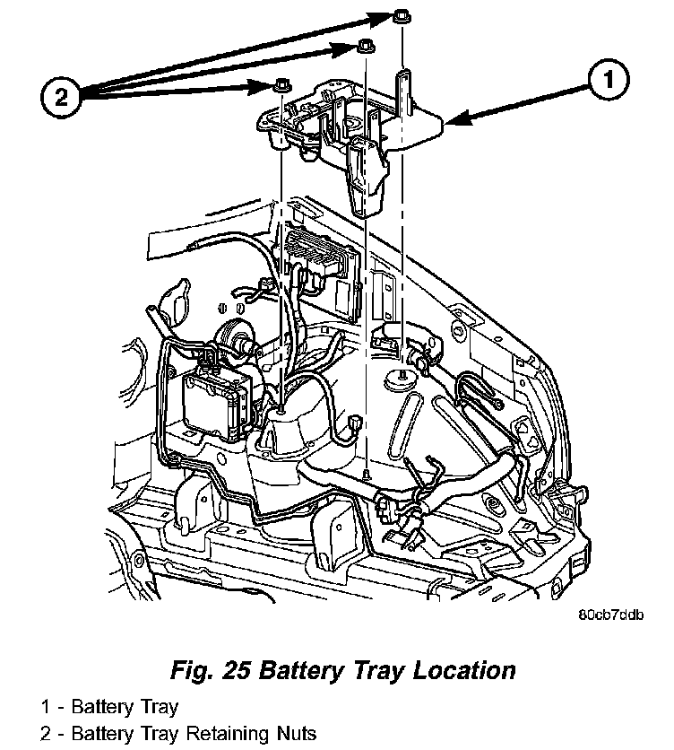 The battery is placed in a molded plastic tray located in the left front corner of the engine compartment (Fig. 25). The battery hold down hardware is contained within the battery tray. A hole in the bottom of the battery tray is fitted with a battery temperature sensor. Refer to Charging System for more information on the battery temperature sensor. Refer to Battery Hold down for more information on hold down hardware.