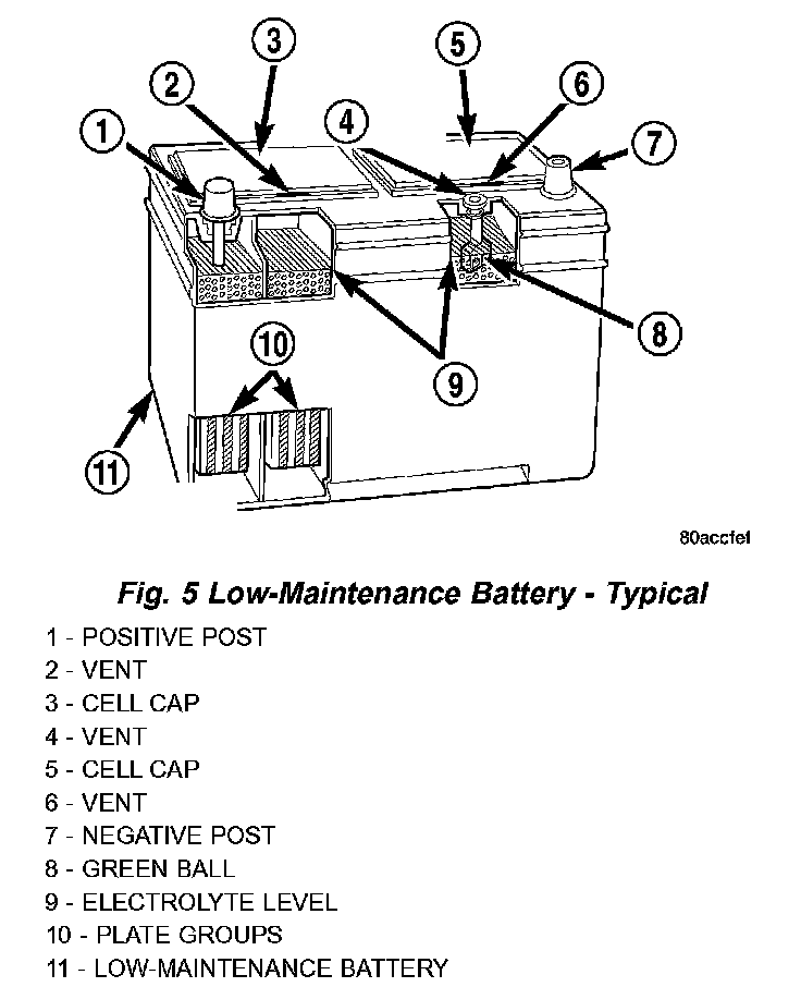 A large capacity, low-maintenance storage battery (Fig. 5) is standard factory-installed equipment on this model. Refer to Battery Specifications for the proper specifications of the factory-installed batteries available on this model. Male post type terminals made of a soft lead material protrude from the top of the molded plastic battery case to provide the means for connecting the battery to the vehicle electrical system. The battery positive terminal post is physically larger in diameter than the negative terminal post to ensure proper battery connection. The letters POS and NEG are also molded into the top of the battery case adjacent to their respective positive and negative terminal posts for identification confirmation. Refer to Battery Cables for more information on the battery cables that connect the battery to the vehicle electrical system.
