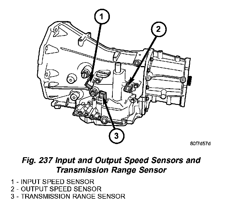 The Input and Output Speed Sensors (Fig. 237) are two-wire magnetic pickup devices that generate AC signals as rotation occurs. They are mounted in the left side of the transmission case and are considered primary inputs to the Transmission Control Module (TCM).