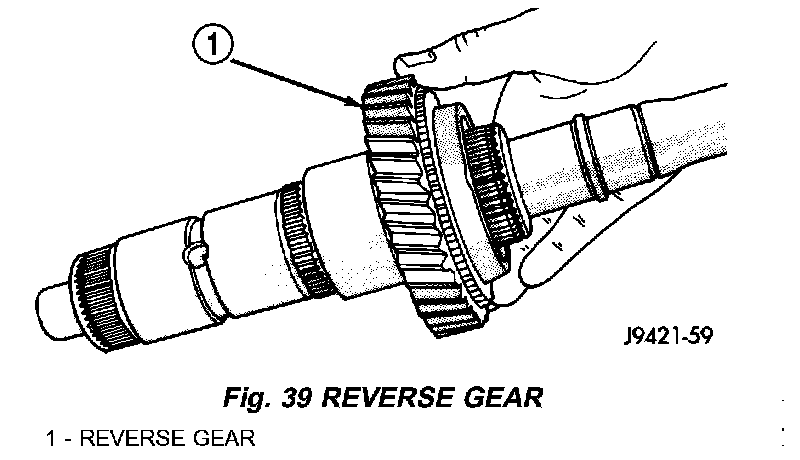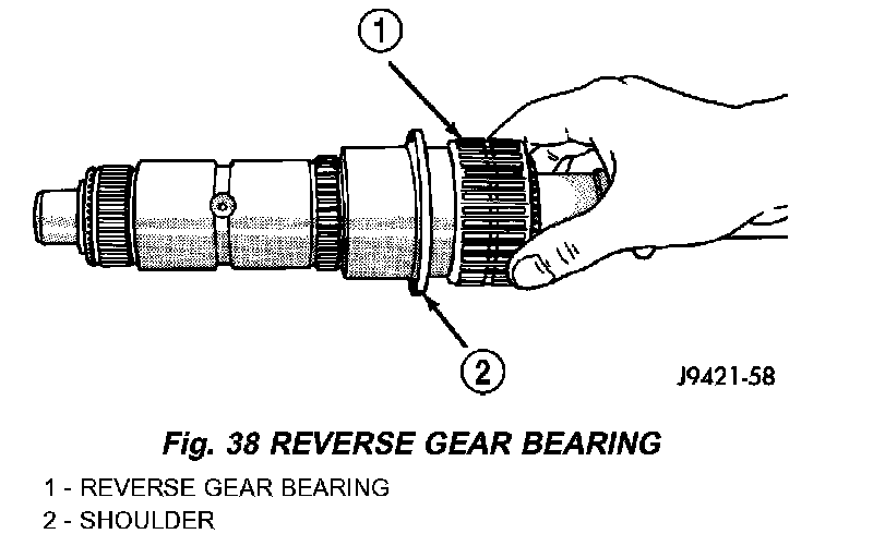 1. Install reverse gear needle bearing on shaft. Slide bearing up against shoulder on output shaft.
