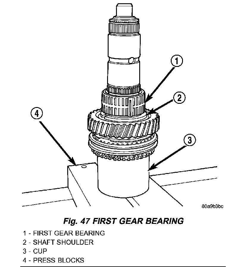 12. Install first gear bearing on output shaft. Verify bearing is seated on shaft shoulder and is properly joined.