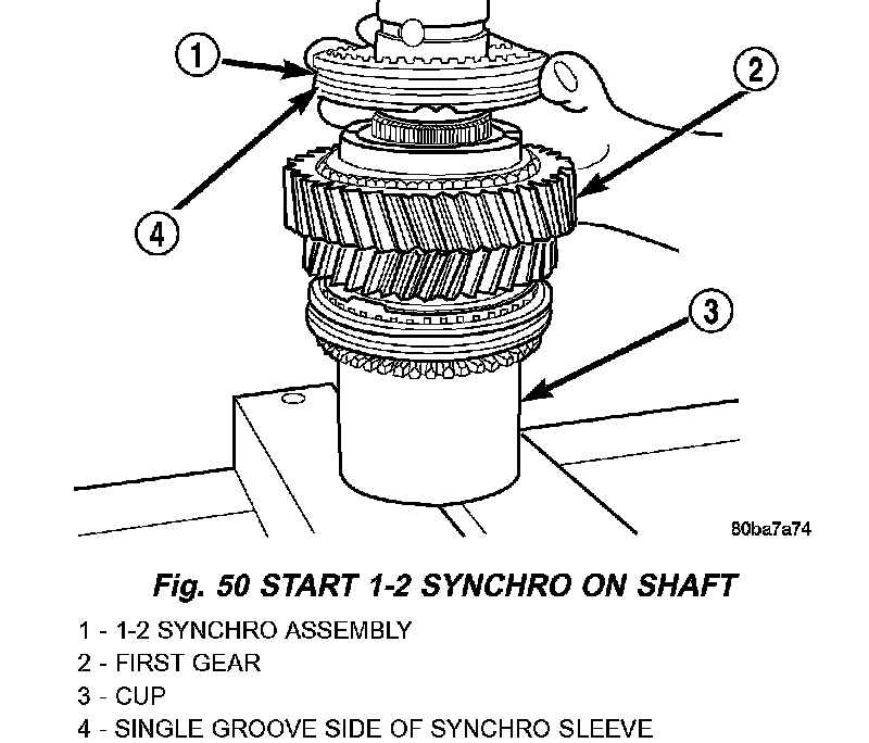 CAUTION: The 1-2 synchro hub and sleeve can be installed backwards. One side of the sleeve has a groove and offset teeth. This side must be installed towards 1st gear (away from 2nd gear).