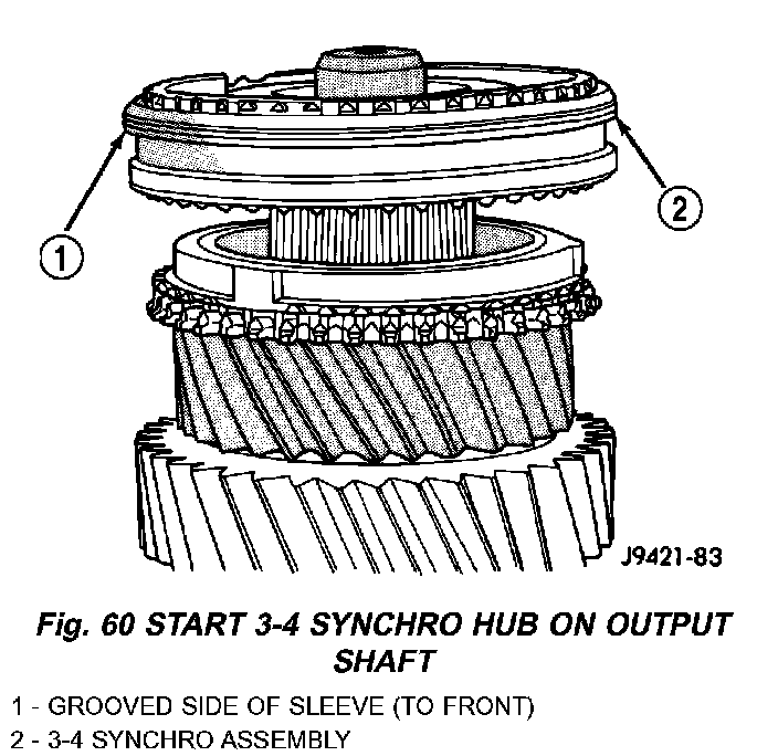 CAUTION: The 3-4 synchro hub and sleeve can be installed backwards. One side of the sleeve has two grooves and offset teeth. This side must be installed towards 3rd gear (away from 4th gear).