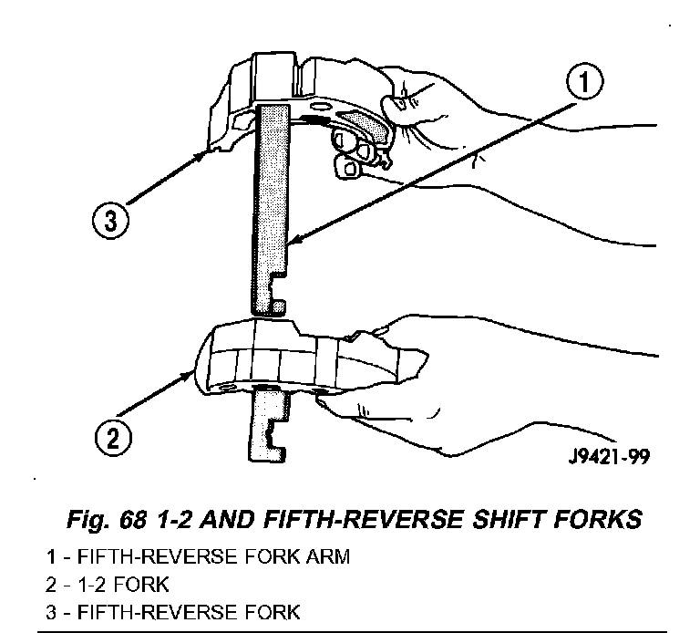 7. Assemble 1-2 and fifth reverse-shift forks. Arm of fifth-reverse fork goes through slot in 1-2 fork.
