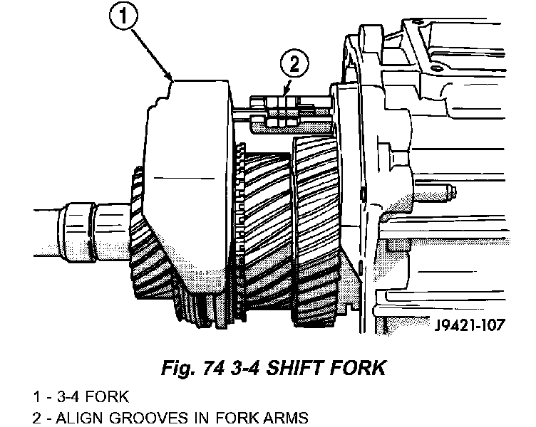 2. Install 3-4 shift fork in synchro sleeve. Verify groove in fork arm is aligned with grooves in 1-2 and fifth-reverse fork arms.