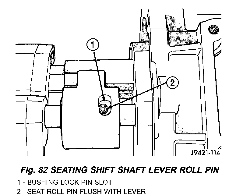 10. Align roll pin holes in shift shaft, lever and bushing, then start roll pin into shaft lever by hand.