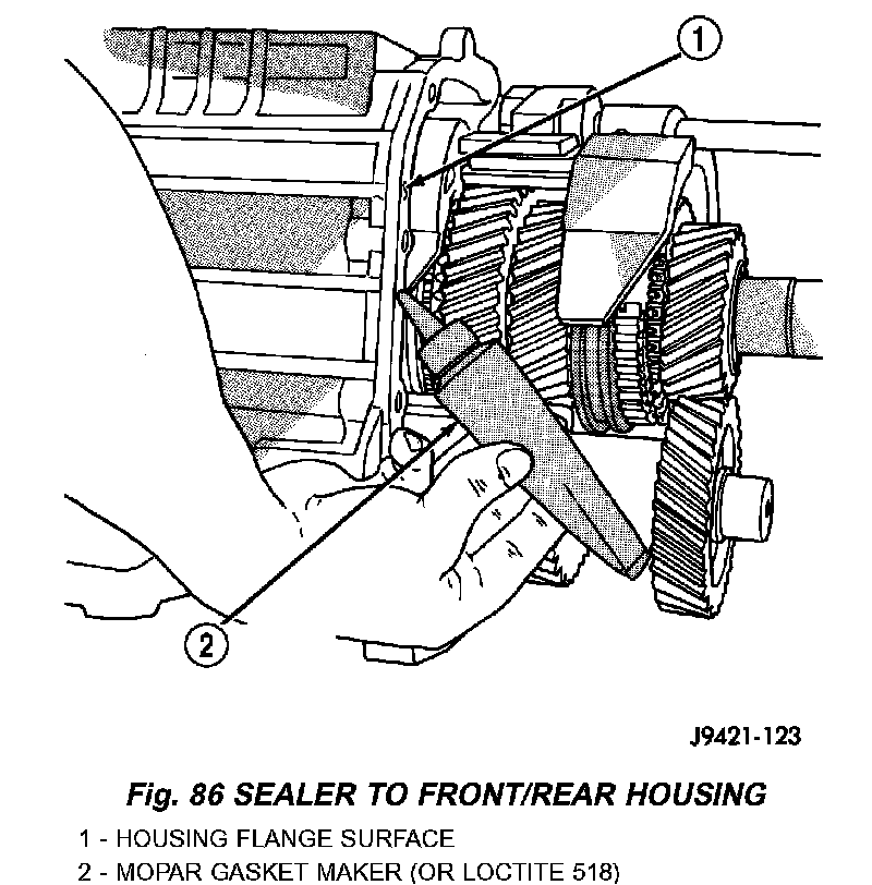 3. Apply 1/8 inch wide bead of Mopar Gasket Maker or equivalent to mating surfaces of front and rear housings.