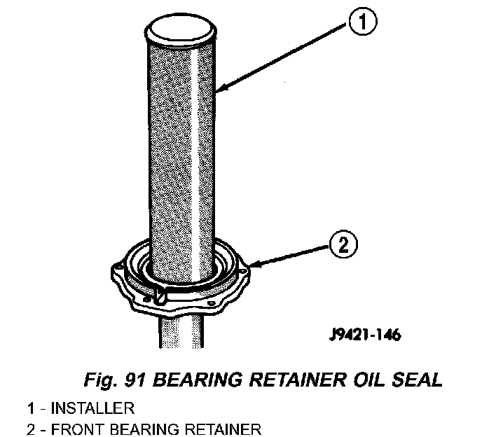 18. Align and install front bearing retainer over input shaft and onto housing mounting surface. Although retainer is one-way fit on housing, be sure bolt holes are aligned before seating retainer.