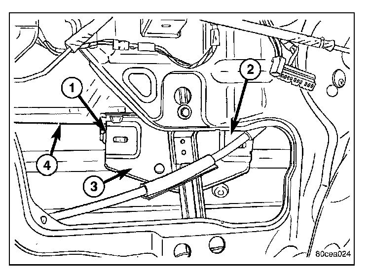3. Raise the glass (4) to the position shown and using a long flat blade or hook type tool, disengage clips (1) attaching glass retainer to regulator lift plate (3).