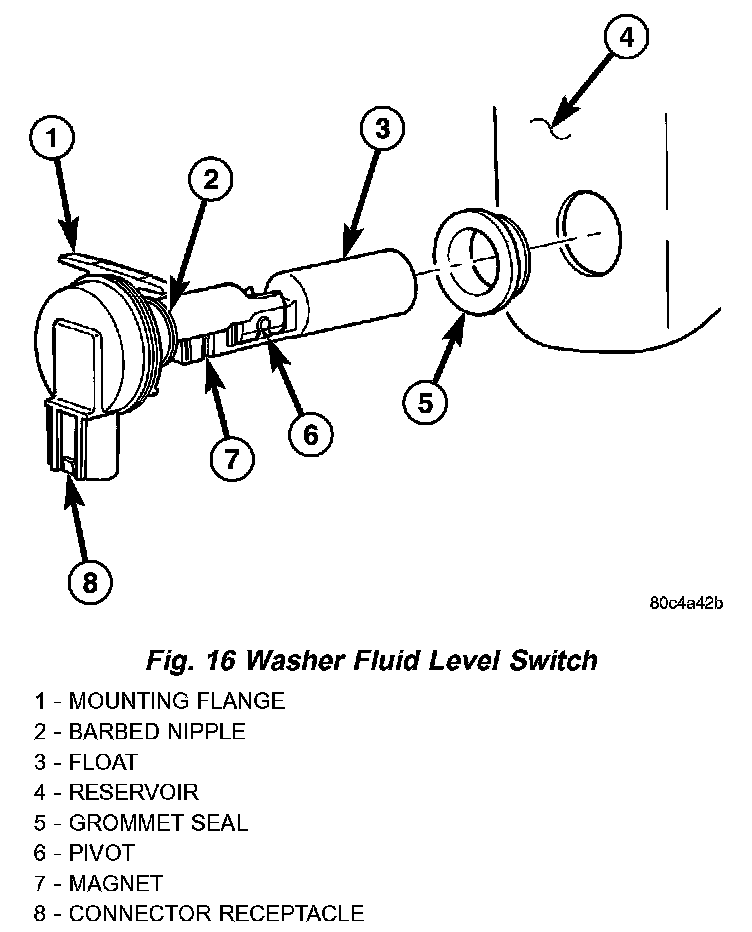 The washer fluid level switch is a single pole, single throw reed-type switch mounted at the rear of the sump area near the bottom of the washer reservoir. Only the molded plastic switch mounting flange and the integral connector receptacle are visible when the switch is installed in the reservoir. A short nipple formation extends from the inner surface of the switch mounting flange, and a barb on the nipple near the switch mounting flange is pressed through a rubber grommet seal installed in the mounting hole of the reservoir. A small, molded plastic float has two pivot pins near its center that are snapped into two receptacles near the ends of two stanchions that extend toward the float from the switch nipple formation. A small magnet is secured within the end of the float nearest the switch nipple formation, and a reed switch is concealed within the nipple. A diagnostic resistor is connected between the two switch terminals within the switch mounting flange. The washer fluid level switch cannot be adjusted or repaired. If faulty or damaged, the switch must be replaced.