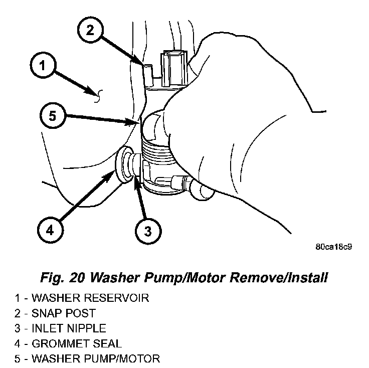 1. Install a new rubber grommet seal into the washer pump mounting hole in the washer reservoir. Always use a new rubber grommet seal on the reservoir.
