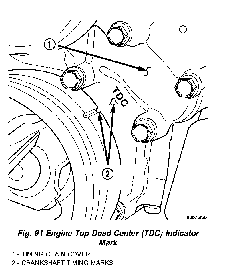 2. Using a mirror, locate the TDC arrow on the front cover (Fig. 91). Rotate the crankshaft until the mark on the crankshaft damper is aligned with the TDC arrow on the front cover. The engine is now at TDC.