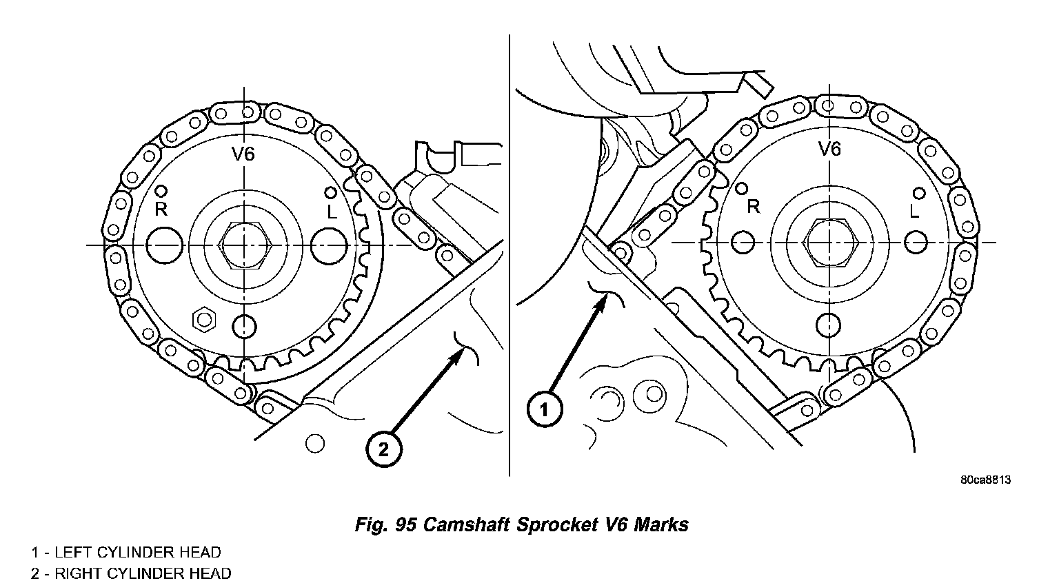 3. Note the location of the V6 mark stamped into the camshaft drive gears. If the V6 mark on each camshaft drive gear is at the twelve o'clock position, the engine is at TDC on the exhaust stroke. If the V6 mark on each gear is at the six o'clock position, the engine is at TDC on the compression stroke. (Fig. 95)