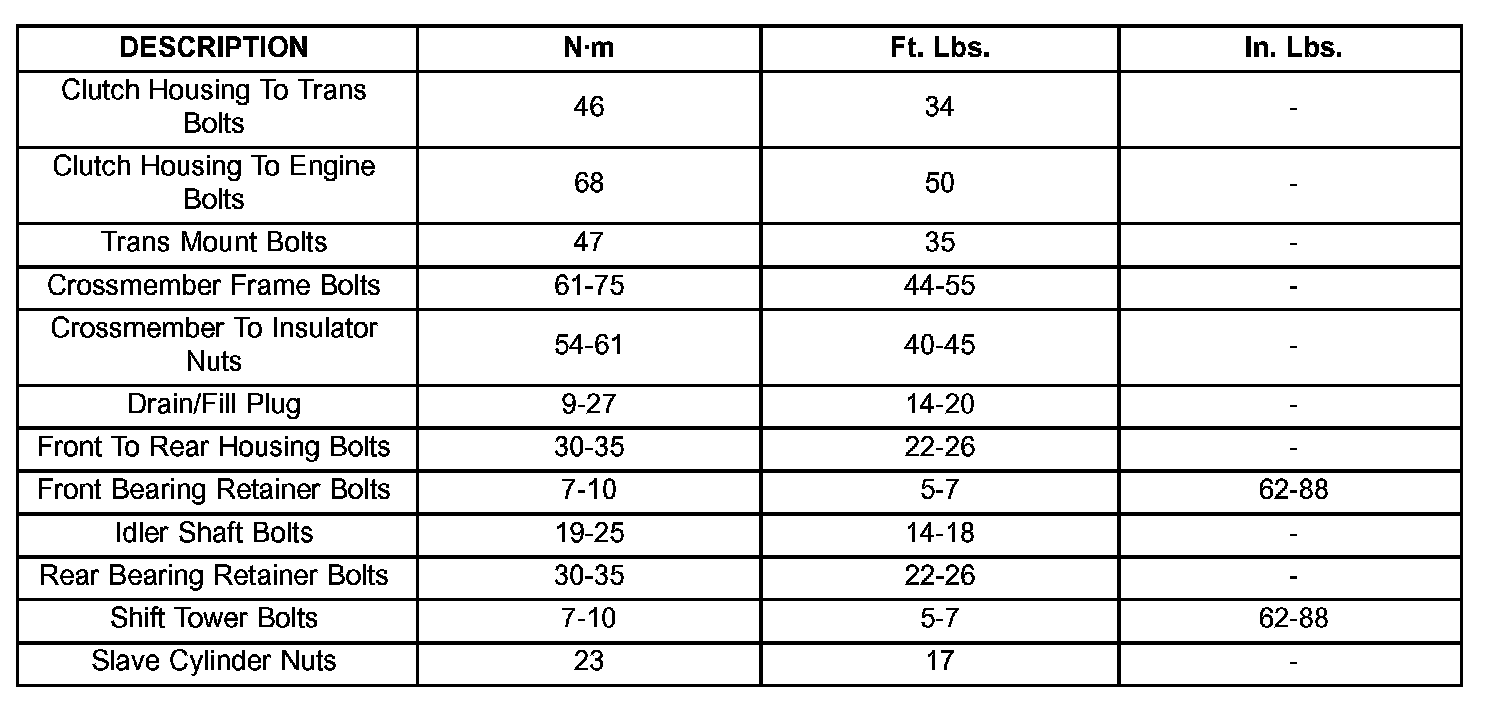 Clutch Housing To Trans Bolts 46 Nm (34 ft. lbs.)