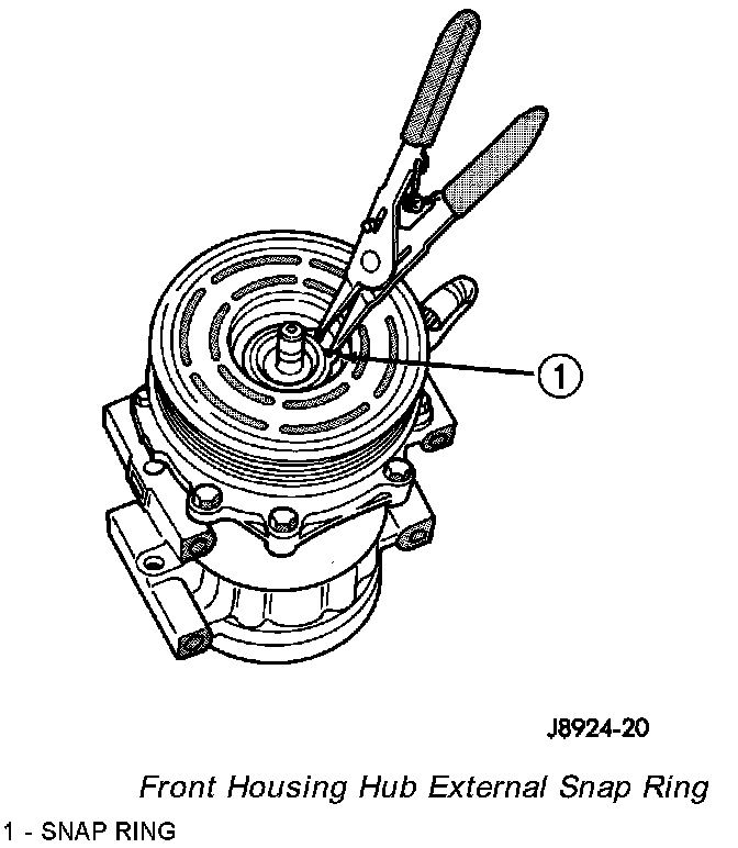 CAUTION: If the snap ring is not fully seated in the groove it will vibrate out, resulting in a clutch failure and severe damage to the front housing of the compressor.