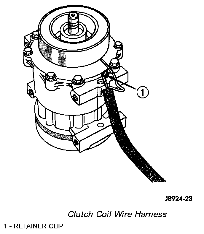 3. Install the screw that secures the clutch coil wire harness retainer clip to the compressor front housing. Tighten the screw securely.