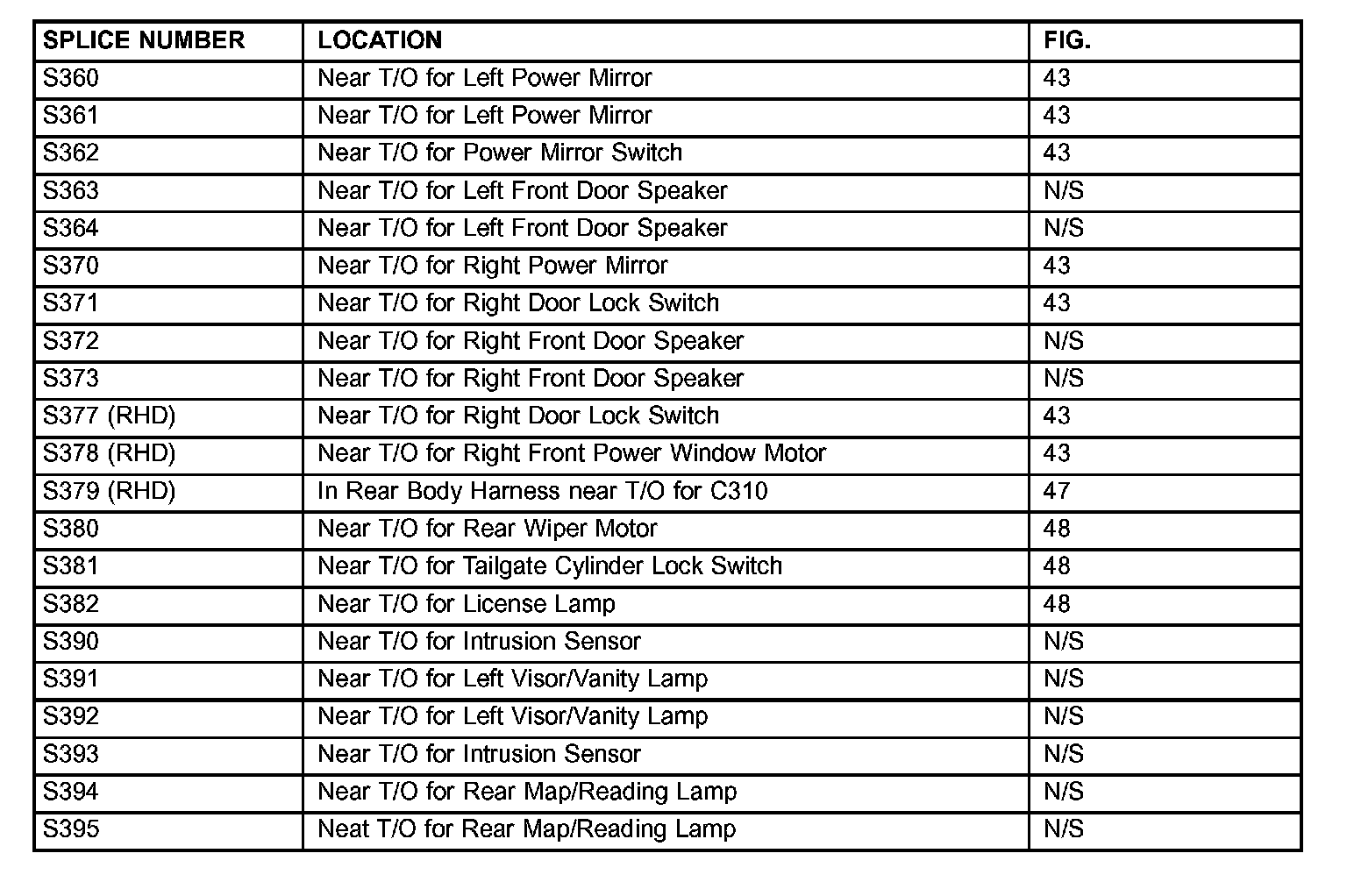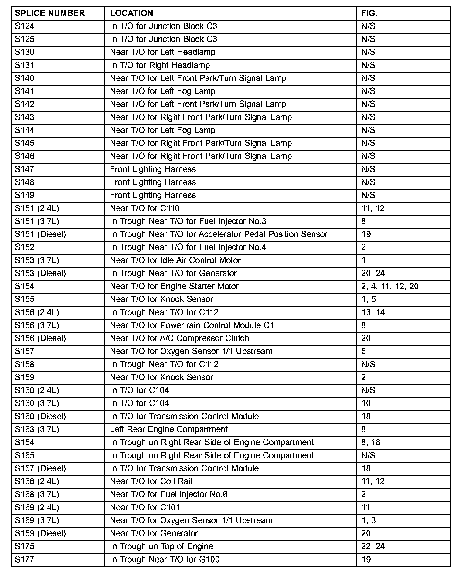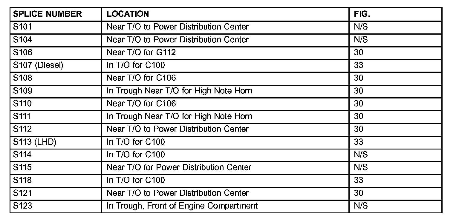 The abbreviation T/O (Take Out) is used in the location column to indicate a point in which the wiring harness branches out to a component.
