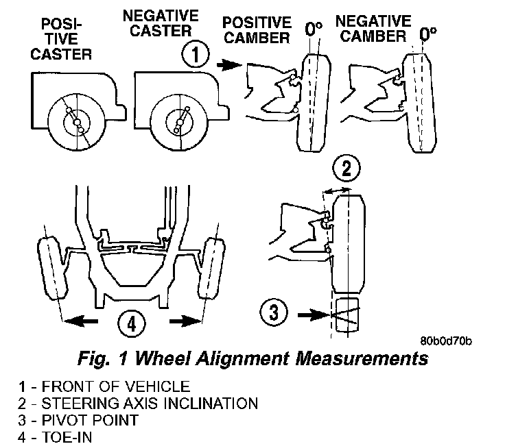 Wheel alignment involves the correct positioning of the wheels in relation to the vehicle. The positioning is accomplished through suspension and steering linkage adjustments. An alignment is considered essential for efficient steering, good directional stability and to minimize tire wear. The most important measurements of an alignment are caster, camber and toe.