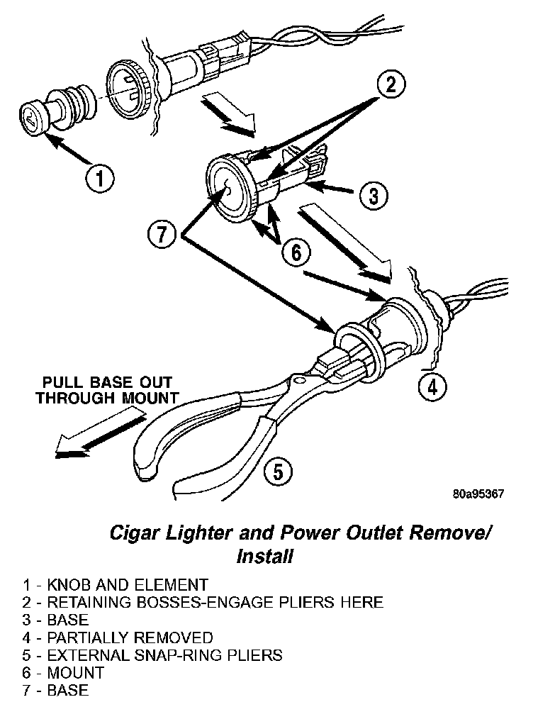4. Insert a pair of external snap ring pliers into the cigar lighter or power outlet receptacle base and engage the tips of the pliers with the retaining bosses of the mount.