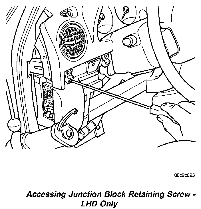 9. Remove the four junction block retaining screws and remove the junction block from under the instrument panel. See for access to the top outboard retaining screw.