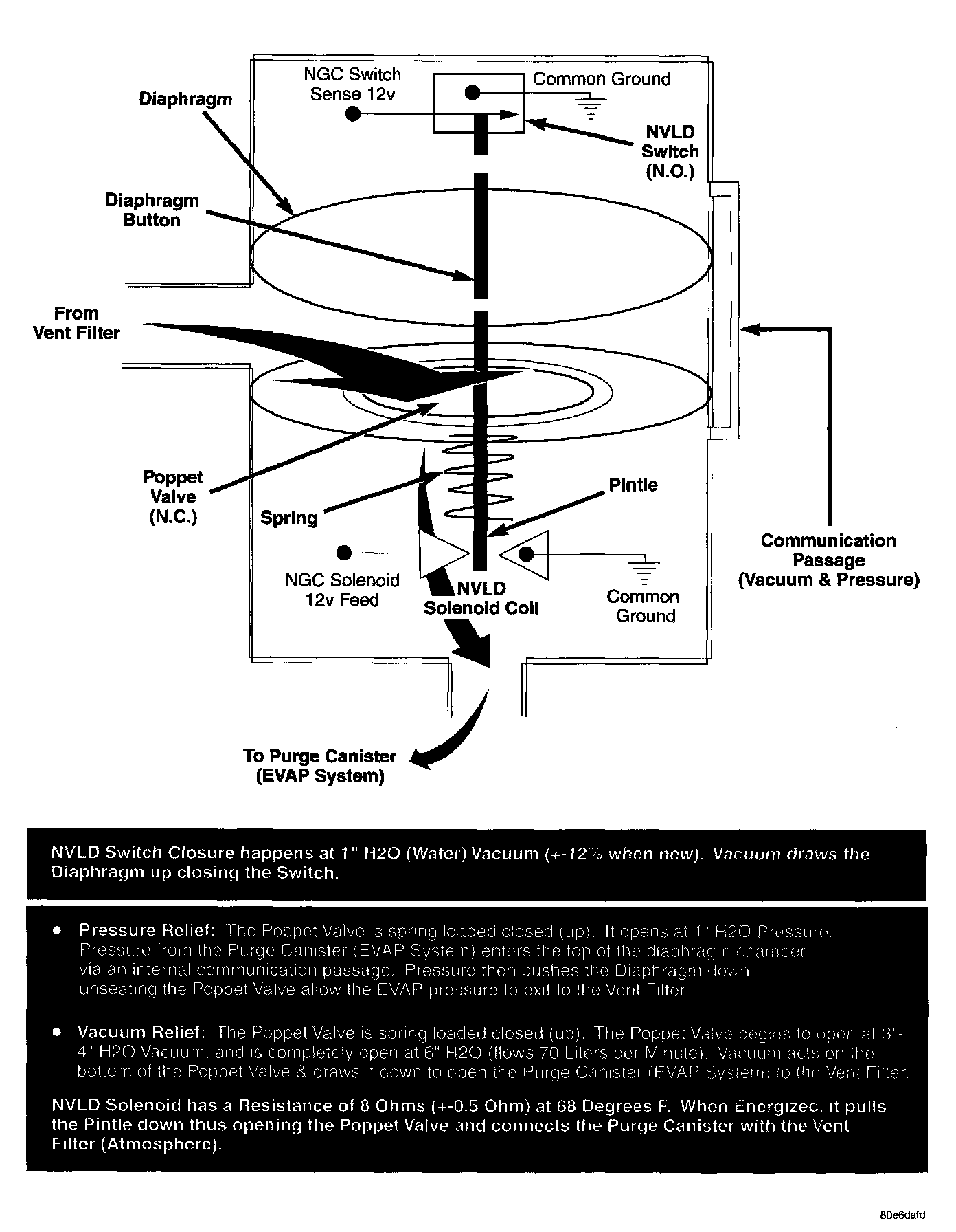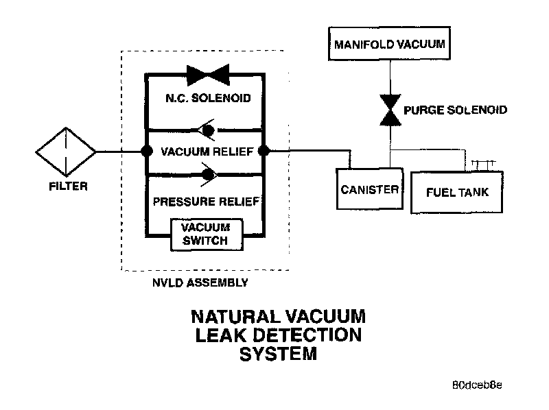 The normally closed valve in the NVLD is intended to maintain the seal on the evaporative system during the engine off condition. If vacuum in the evaporative system exceeds 3 - 6 inches H20 (0.75 - 1.5 kPa), the valve will be pulled off the seat, opening the seal. This will protect the system from excessive vacuum as well as allowing sufficient purge flow in the event that the solenoid was to become inoperative. The solenoid actuates the valve to unseal the canister vent while the engine is running. It also will be used to close the vent during the medium and large leak tests and during the purge flow check. This solenoid requires initial 1.5 amps of current to pull the valve open but after 100 ms. will be duty cycled down to an average of about 150 mA for the remainder of the drive cycle.