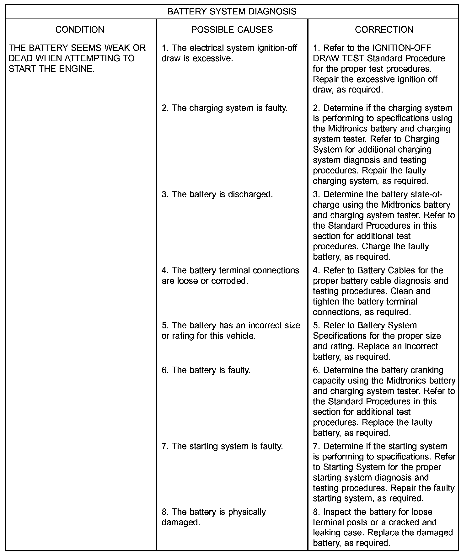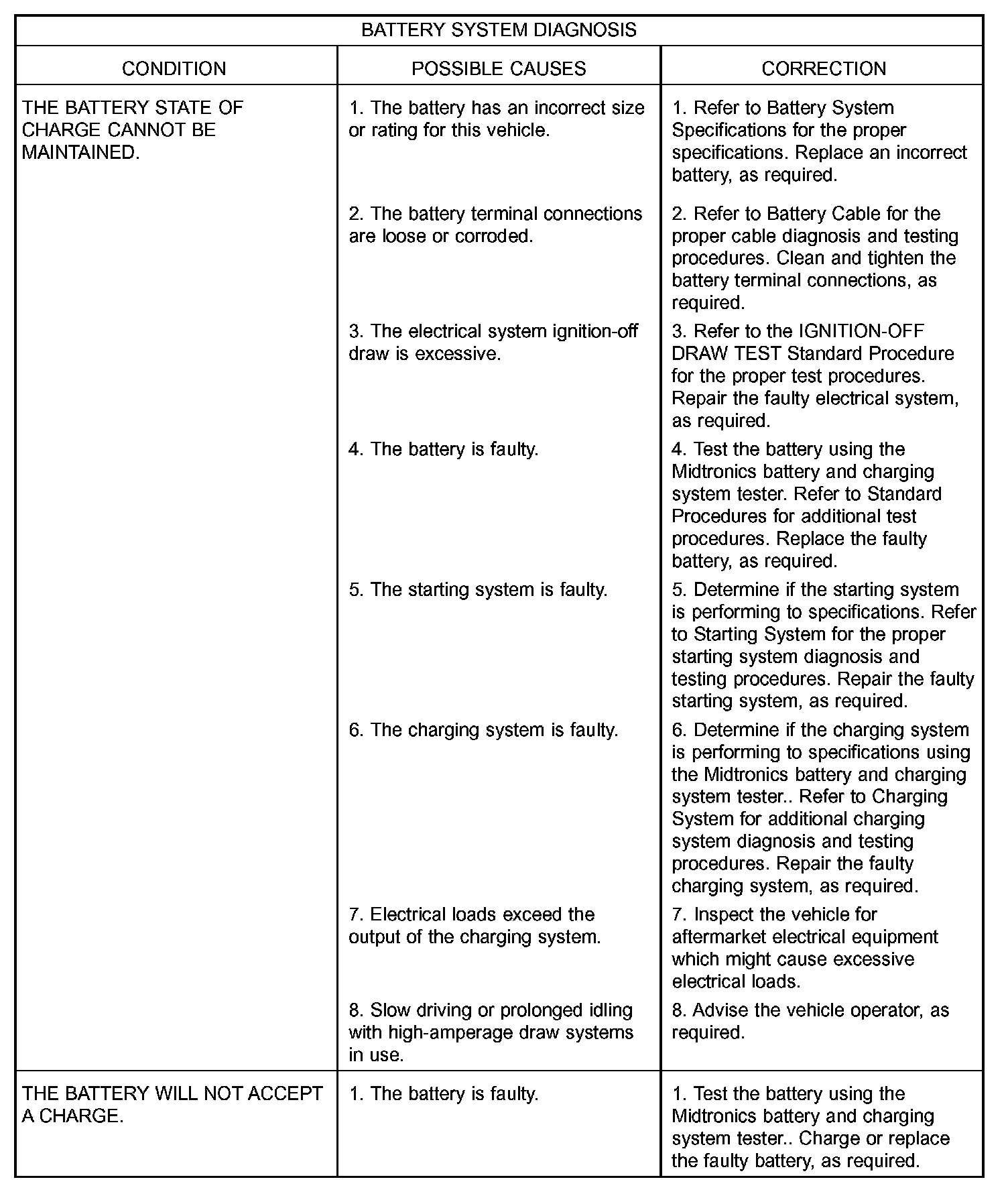 The Midtronics automotive battery and charging system tester is designed to help the dealership technicians diagnose the cause of a defective battery or charging system. Follow the instruction manual supplied with the tester to properly diagnose a vehicle. If the instruction manual is not available refer to the standard procedure in this section, which includes the directions for using the midtronics electrical system tester.