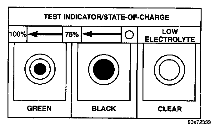 An indicator (hydrometer) built into the top of the battery case provides visual information for battery testing. Like a hydrometer, the built-in indicator measures the specific gravity of the battery electrolyte. The specific gravity of the electrolyte reveals the battery state-of-charge; however, it will not reveal the cranking capacity of the battery A load test must be performed to determine the battery cranking capacity Refer to Standard Procedures for the proper battery load test procedures.