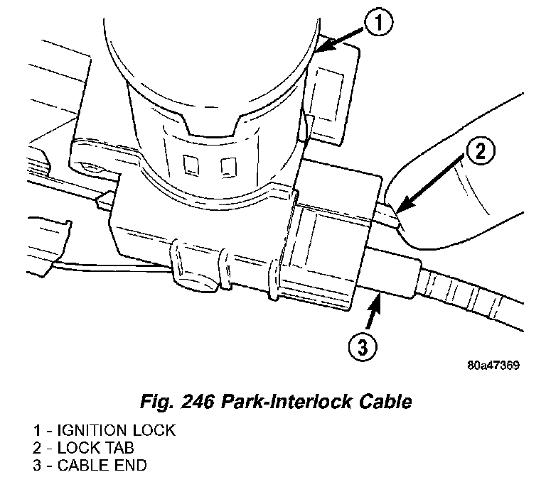 2. With the ignition switch in the "RUN" position depress the park-interlock cable locking tab, located on top of the cable connector (Fig. 246) at the steering column and pull the cable straight out.