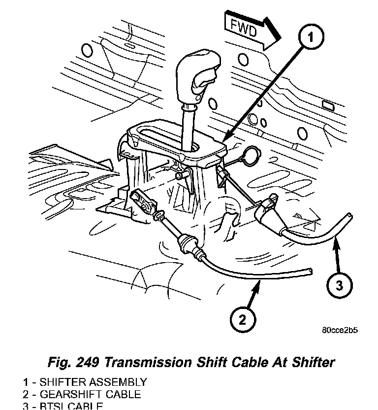 5. Disconnect the park-interlock cable from the shift lever assembly and remove the cable from the shifter assembly bracket (Fig. 247).