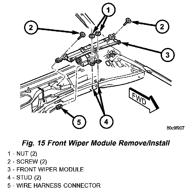 7. Remove the two nuts that secure the front wiper module to the two weld studs on the bottom of the cowl plenum panel.