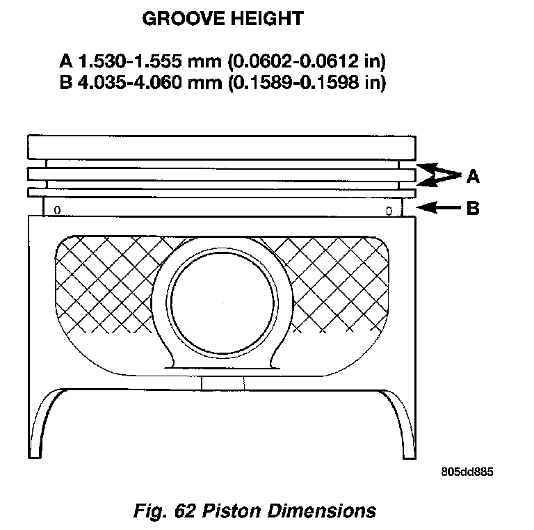3. Measure the ring side clearance with a feeler gauge fitted snugly between the ring land and ring (Fig. 62) (Fig. 63). Rotate the ring in the groove. It must move freely around circumference of the groove.