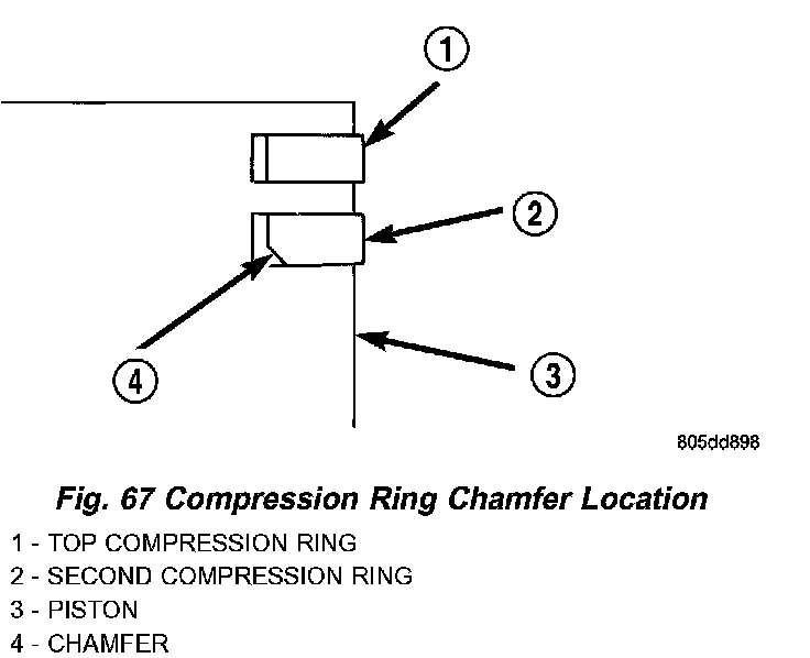 7. The second compression ring has a slight chamfer on the bottom of the inside edge and a dot on the top for correct installation (Fig. 66) and (Fig. 67).