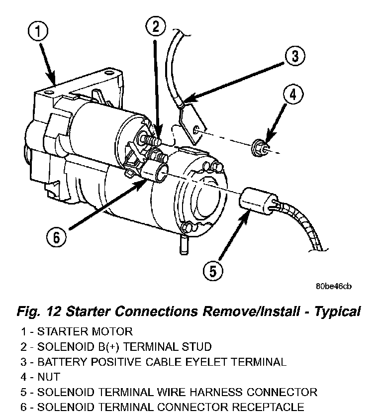 5. Lower starter motor from front of transmission housing far enough to access and remove nut securing battery positive cable eyelet terminal to starter solenoid B(+) terminal stud (Fig. 12). Always support starter motor during this process. Do not let starter motor hang from wire harness.