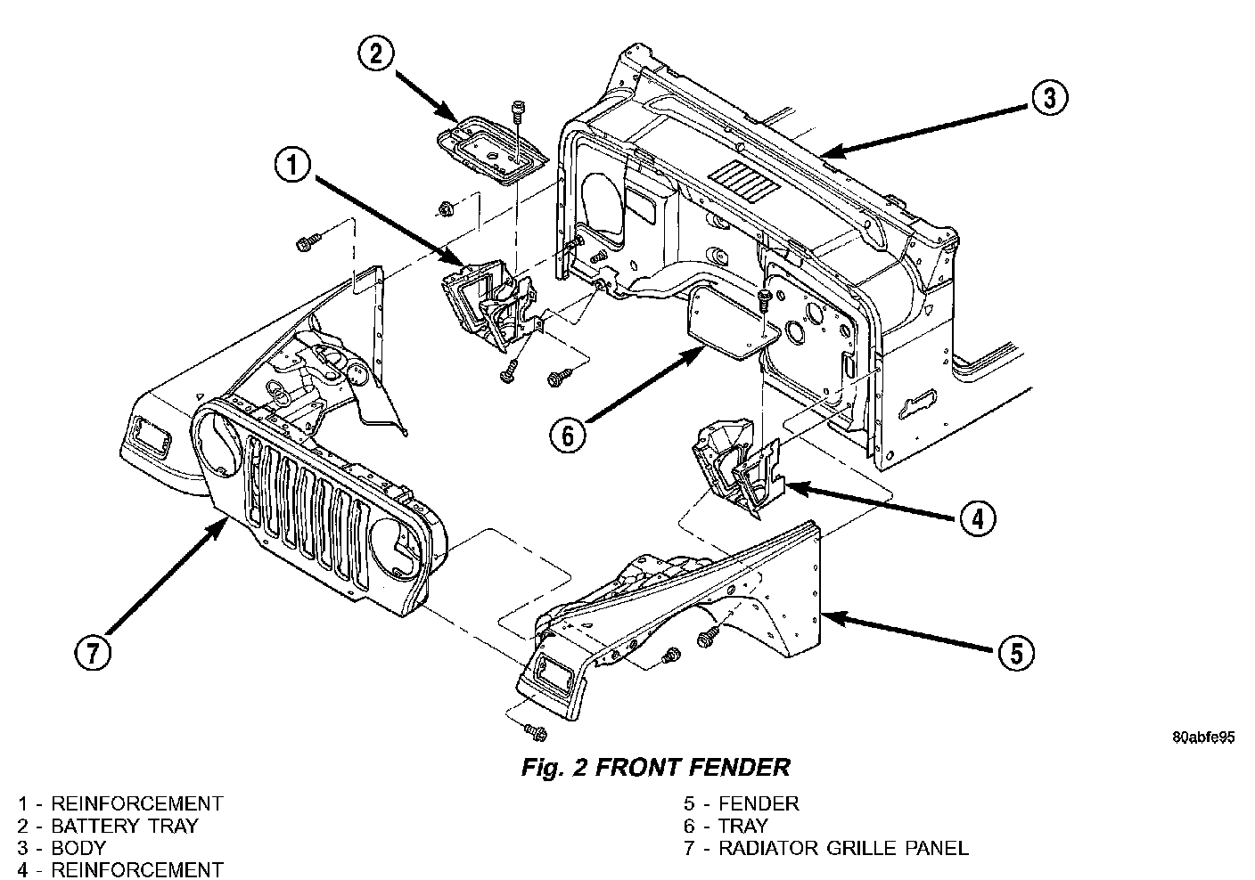 14. Remove the bolts attaching the fender to the battery tray reinforcement bracket.