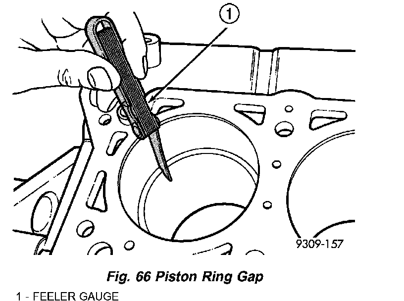 1. Wipe cylinder bore clean. Insert ring and push down with piston to ensure it is square in bore. The ring gap measurement must be made with the ring positioning at least 12 mm (0.50 inch) from bottom of cylinder bore. Check gap with feeler gauge (Fig. 66). Refer to Specifications.
