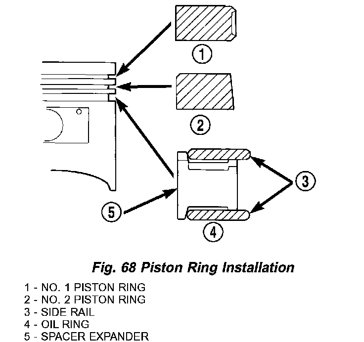 1. Install rings with manufacturers I.D. mark facing up, to the top of the piston (Fig. 68).