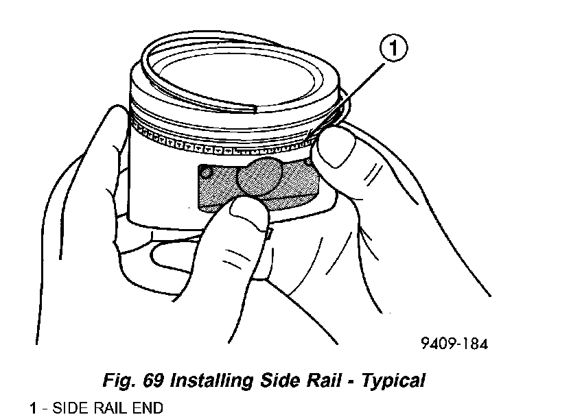 2. Install the side rail by placing one end between the piston ring groove and the expander. Hold end firmly and press down the portion to be installed until side rail is in position. Do not use a piston ring expander (Fig. 69).