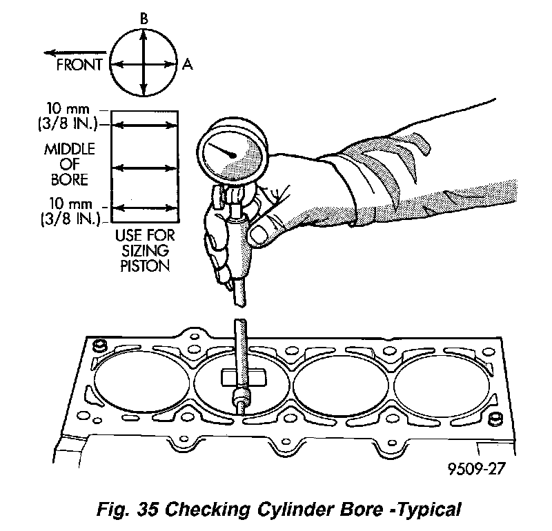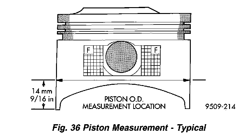 Piston and cylinder wall must be clean and dry. Piston diameter should be measured 90 degrees to piston pin about 14 mm (9/16 inch.) from the bottom of the skirt as shown in (Fig. 36). Cylinder bores should be measured halfway down the cylinder bore and transverse to the engine crankshaft center line shown in (Fig. 35). Refer to Specifications. Correct piston to bore clearance must be established in order to assure quiet and economical operation.