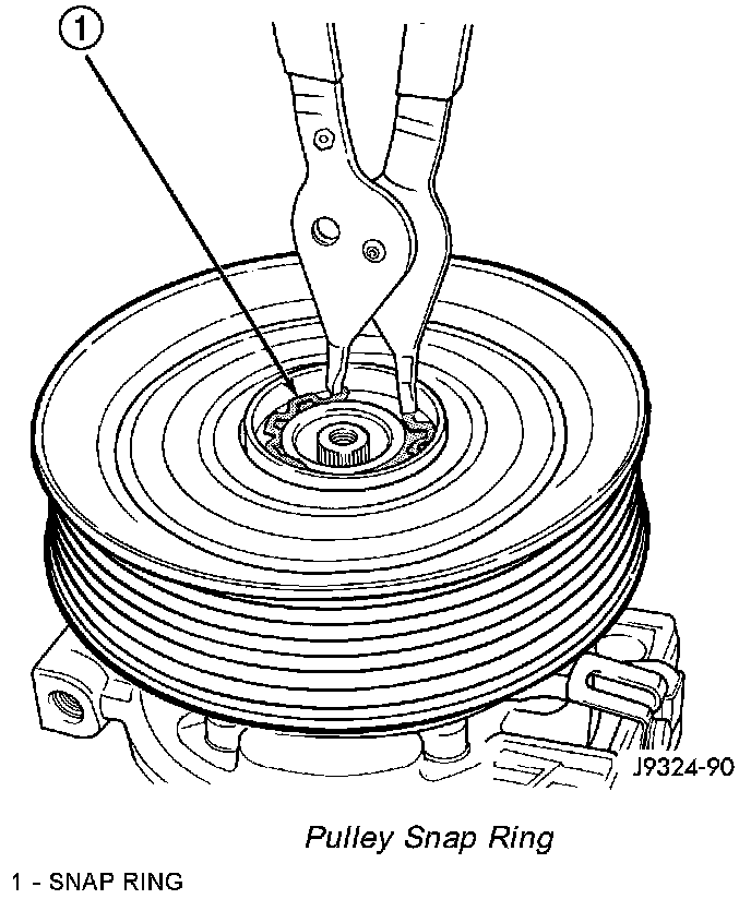 5. Remove the external snap ring that secures the compressor clutch pulley to the nose of the compressor front housing with snap ring pliers (Special Tool C-4574) or equivalent and slide the pulley assembly off of the compressor
