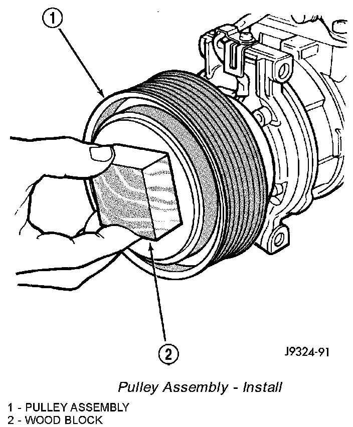 4. Install the pulley assembly onto the compressor. If necessary, place a block of wood on the friction surface and tap gently with a hammer.