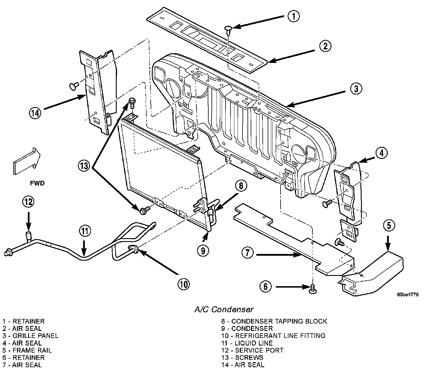 CAUTION: Before removing the condenser, note the location of each of the radiator and condenser air seals. These seals are used to direct air through the condenser and radiator. The air seals must be reinstalled in their proper locations in order for the air conditioning and engine cooling systems to perform as designed.