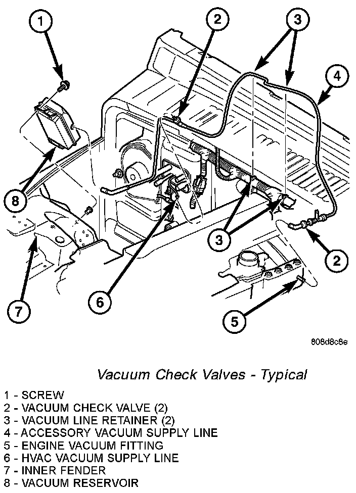1. Remove the vacuum check valve from the fitting at the engine intake manifold and the accessory vacuum supply line.