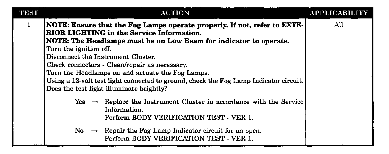 FOG LAMP INDICATOR INOPERATIVE - DOMESTIC