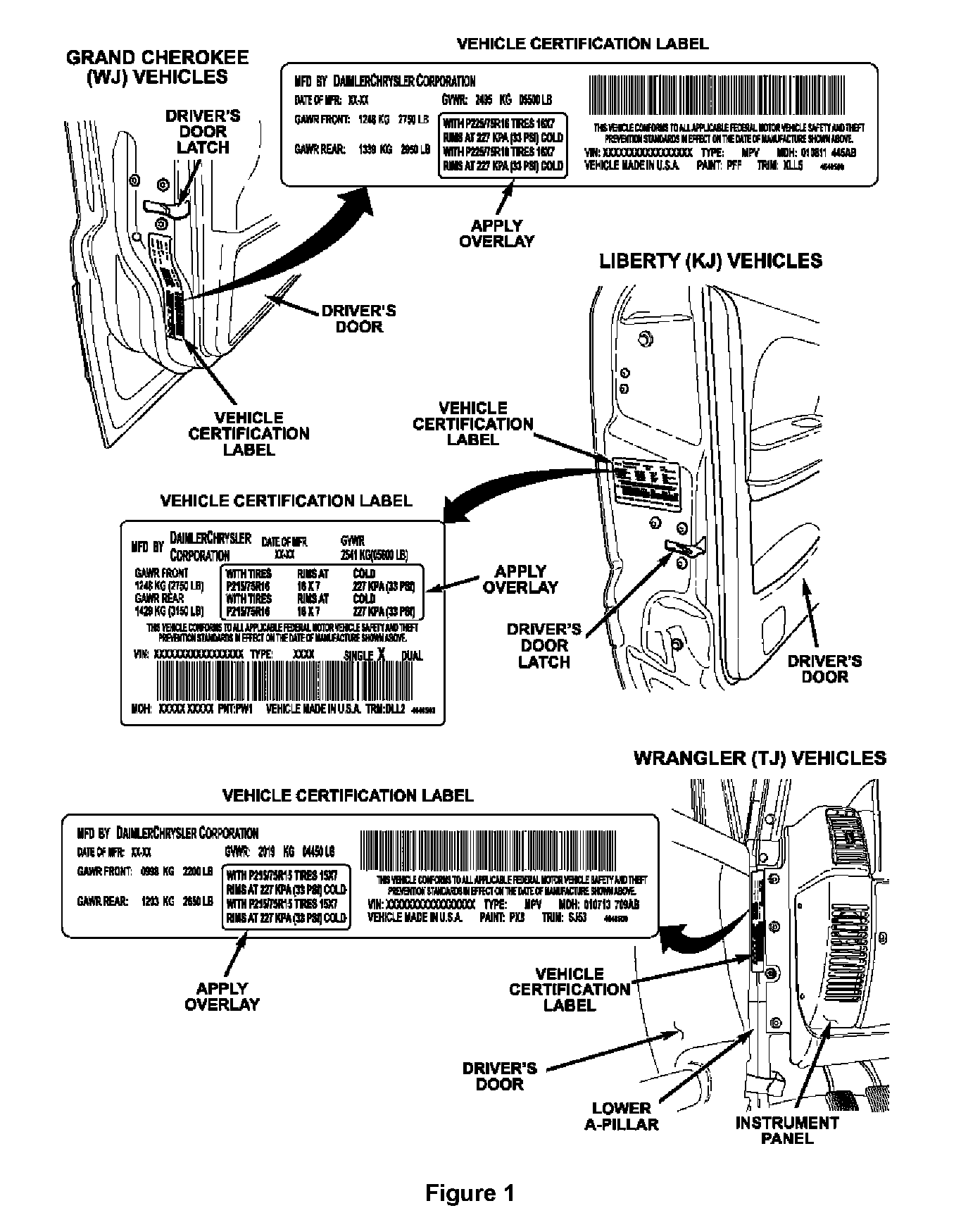 1. Open the driver's door and locate the Vehicle Certification Label on the lower rear of the driver's door (WJ/KJ) or on the lower A-pillar (TJ) as shown (Figure 1).