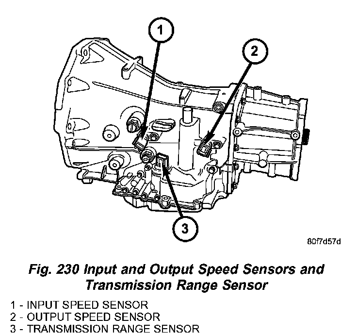 The Input and Output Speed Sensors (Fig. 230) are two-wire magnetic pickup devices that generate AC signals as rotation occurs. They are mounted in the left side of the transmission case and are considered primary inputs to the Transmission Control Module (TCM).