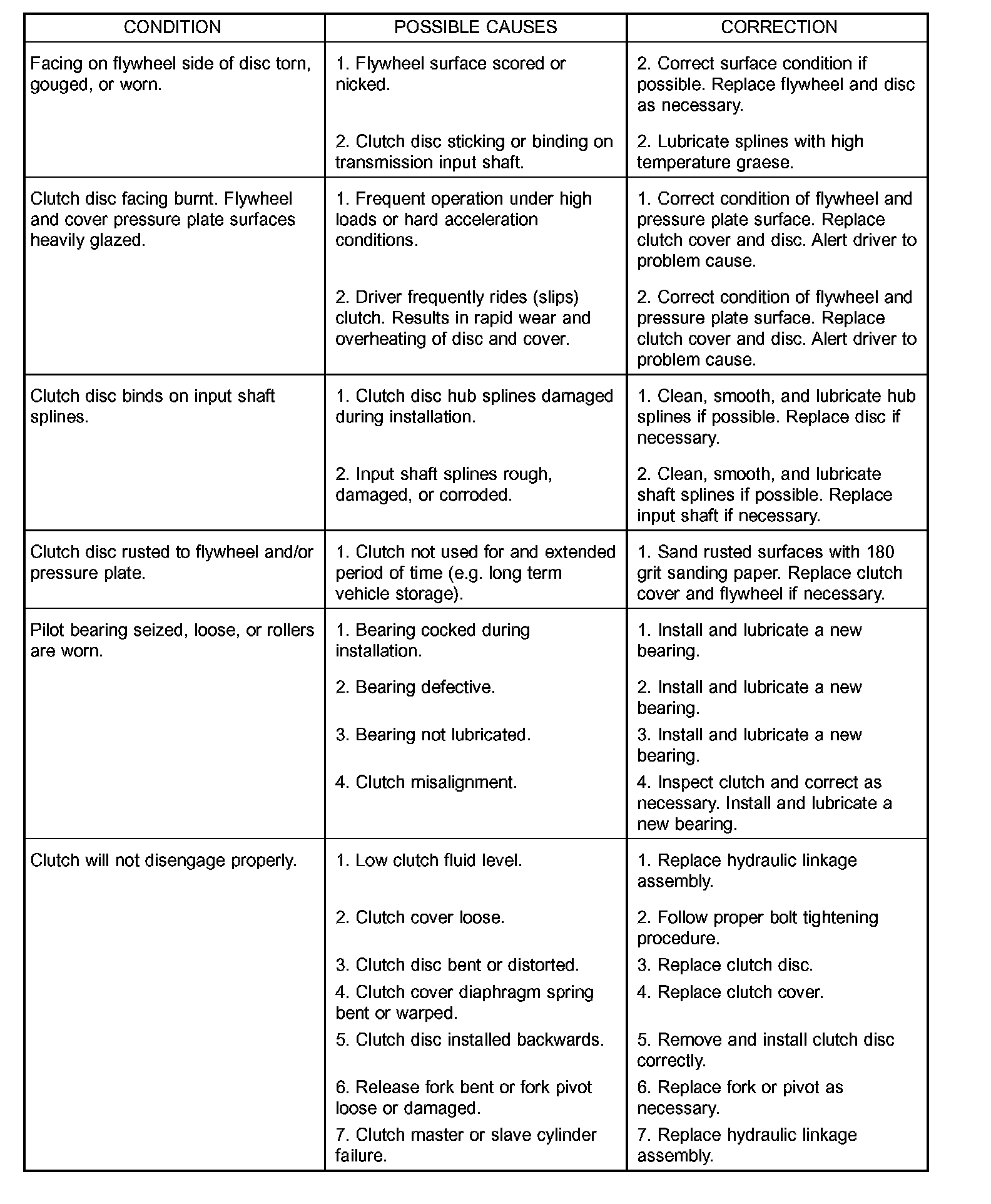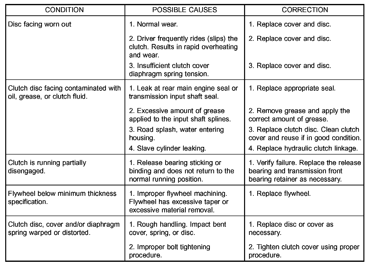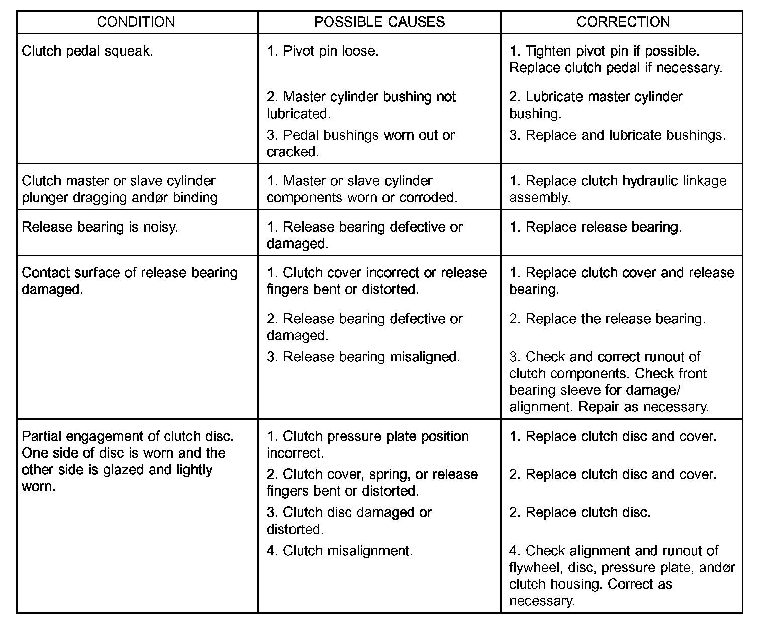 The diagnosis charts Diagnosis Chart describe common clutch problems, causes and correction. Conditions, causes and corrective action are outlined in the indicated columns.