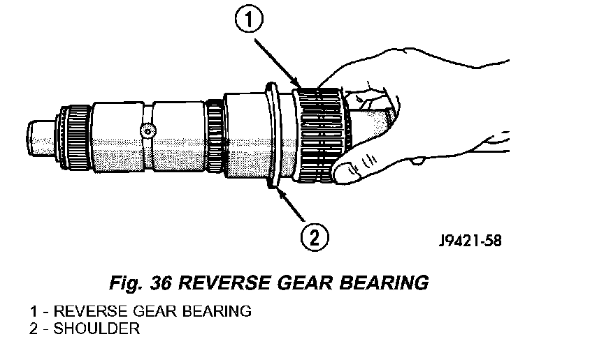 1. Install reverse gear needle bearing on shaft (Fig. 36). Slide bearing up against shoulder on output shaft.