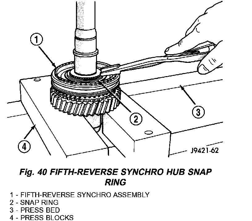5. Install new fifth-reverse hub snap ring (Fig. 40) and verify snap ring is seated in the shaft groove.